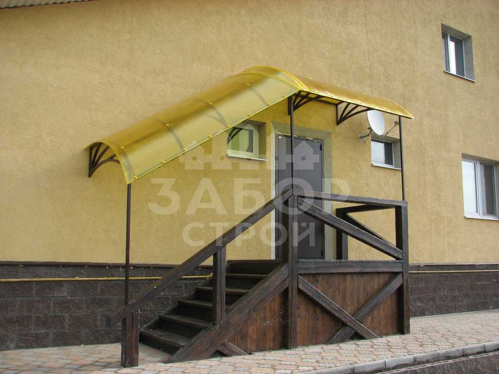 Поэтому компания "Навес Строй" настоятельно рекомендует не экономить, а усилить каркас навеса над крыльцом более жёсткими профилями с увеличенной толщиной металла и количеством несущих ферм.